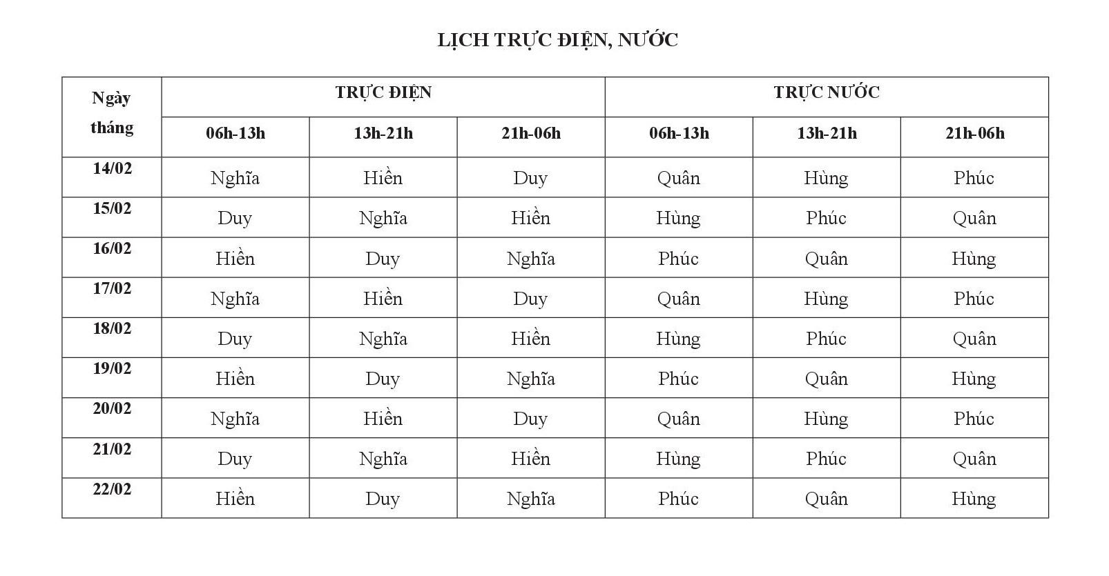 Các bộ phận trực của Phòng HCTH làm việc theo các bảng phân công dưới đây