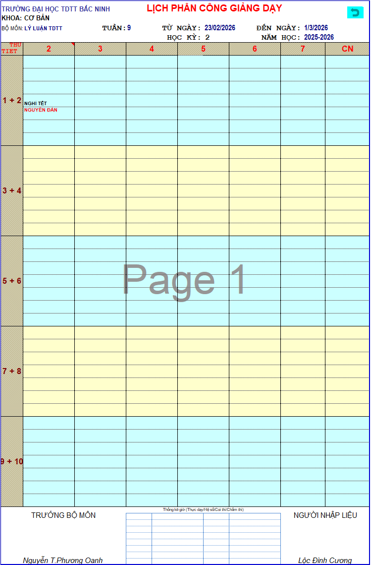 Thời khóa biểu tuần 9 – Năm học 2025-2026