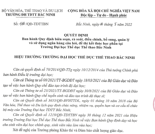 Quyết định ban hành Quy định biên soạn, rà soát, điều chỉnh, bổ sung, quản lý và sử dụng ngân hàng câu hỏi, đề thi kết thúc học phần tại Trường Đại học TDTT Bắc Ninh