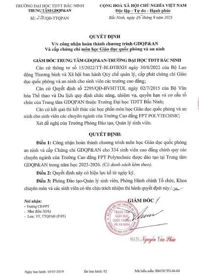 Quyết định hoàn thành chương trình GDQP&AN Trường Cao đẳng FPT Polytechnic được đạo tạo tại Trung tâm QPAN&AN trong năm học 2025-2026