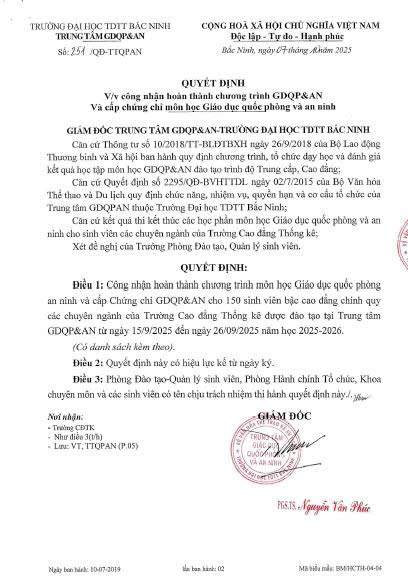 Quyết định hoàn thành chương trình GDQP&AN Trường Cao đẳng Thống kê được đạo tạo tại Trung tâm QPAN&AN từ ngày 15/9/2025 đến ngày 26/9/2025