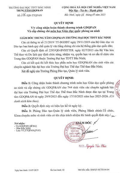 Quyết định hoàn thành chương trình GDQP&AN Trường Đại học TDTT Bắc Ninh được đạo tạo tại Trung tâm QPAN&AN từ ngày 29/9/2025 đến ngày 17/10/2025