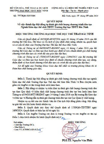 Quyết định thành lập hội đồng TĐG chất lượng CTĐT ngành GDTC