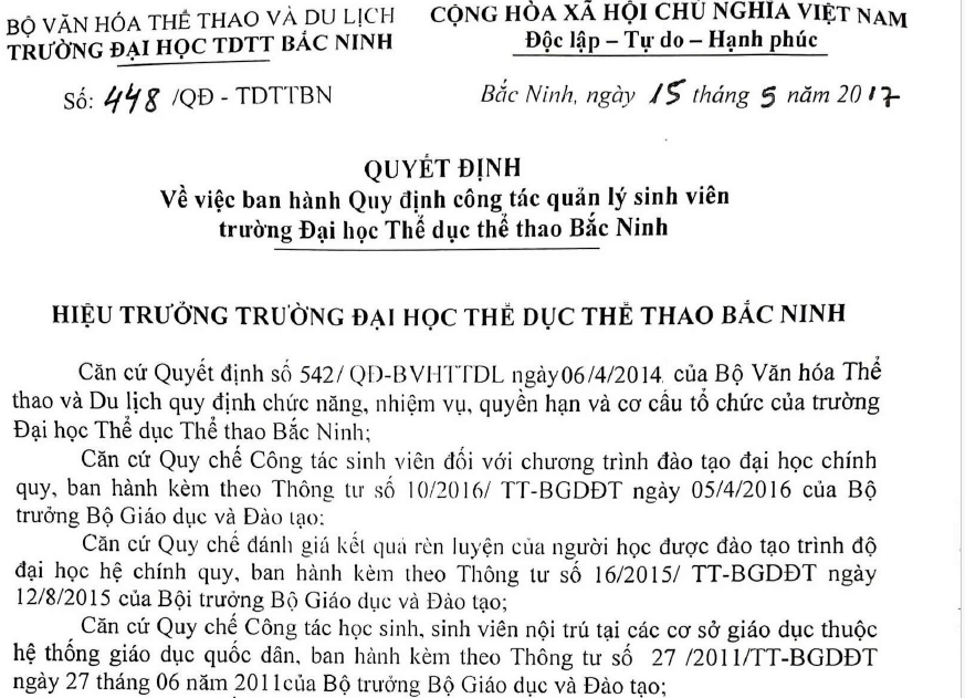 Quyết định về việc ban hành Quy định công tác quản lý sinh viên Trường Đại học TDTT Bắc Ninh