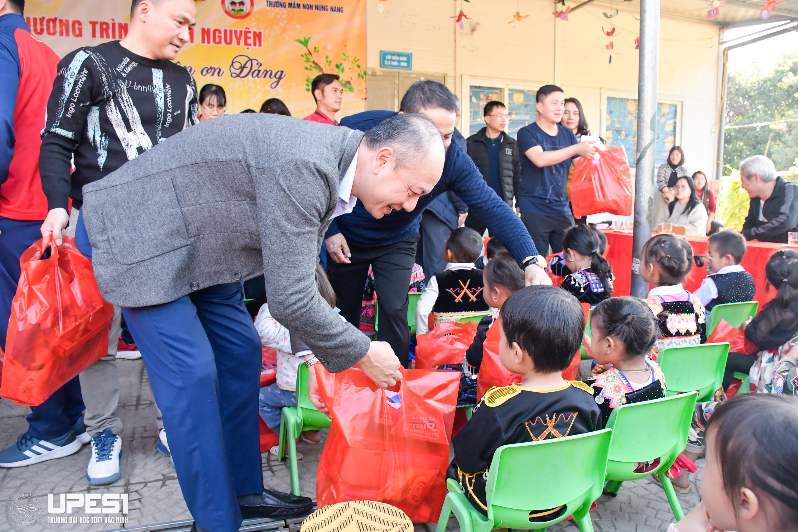 NGƯT.PGS.TS. Nguyễn Văn Phúc – Bí thư Đảng ủy, Hiệu trưởng Nhà trường trao quà cho Điểm trường Xì Miền Khan 1, Trường Mầm Non Nùng Nàng, phường Tân Phong, tỉnh Lai Châu