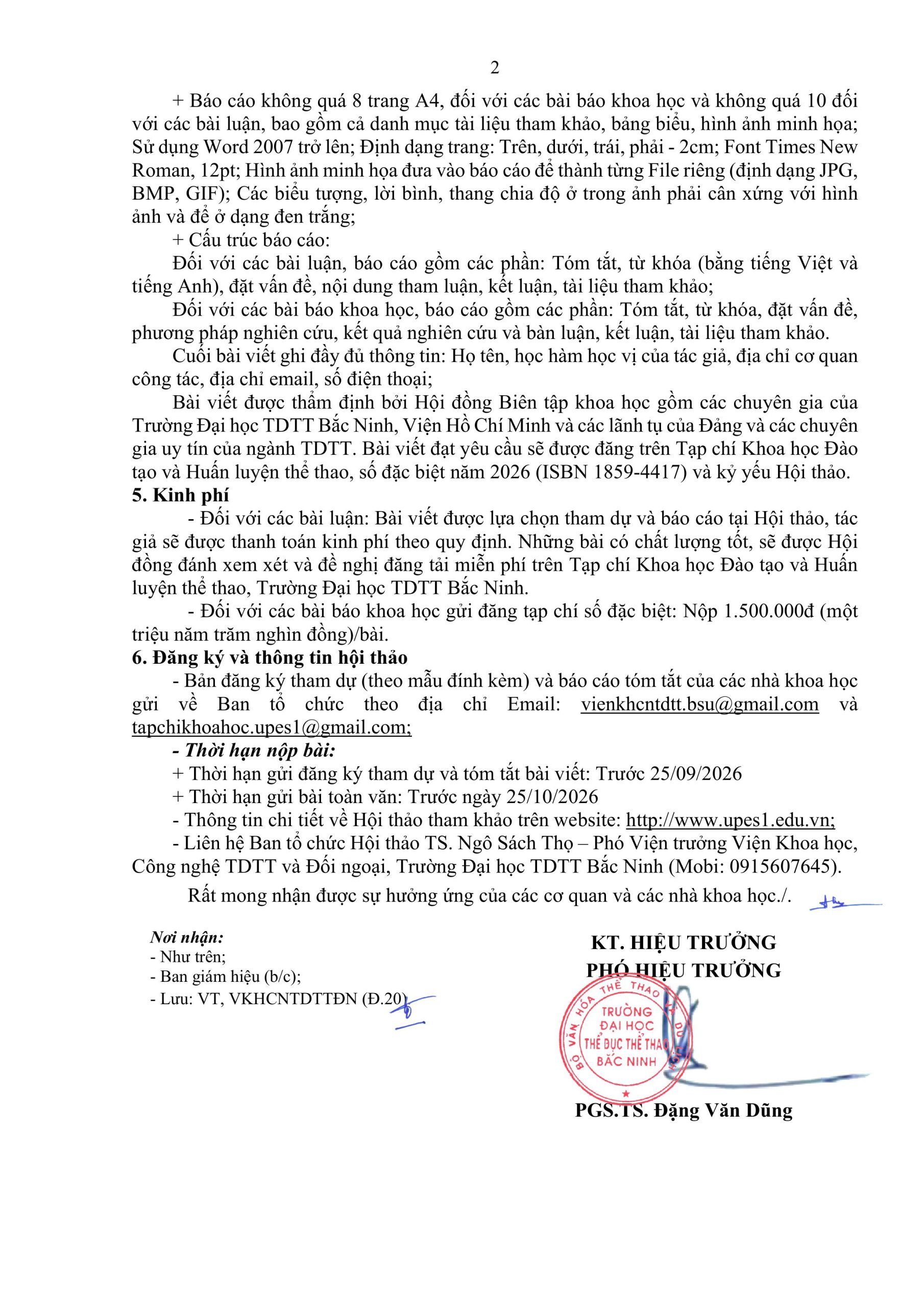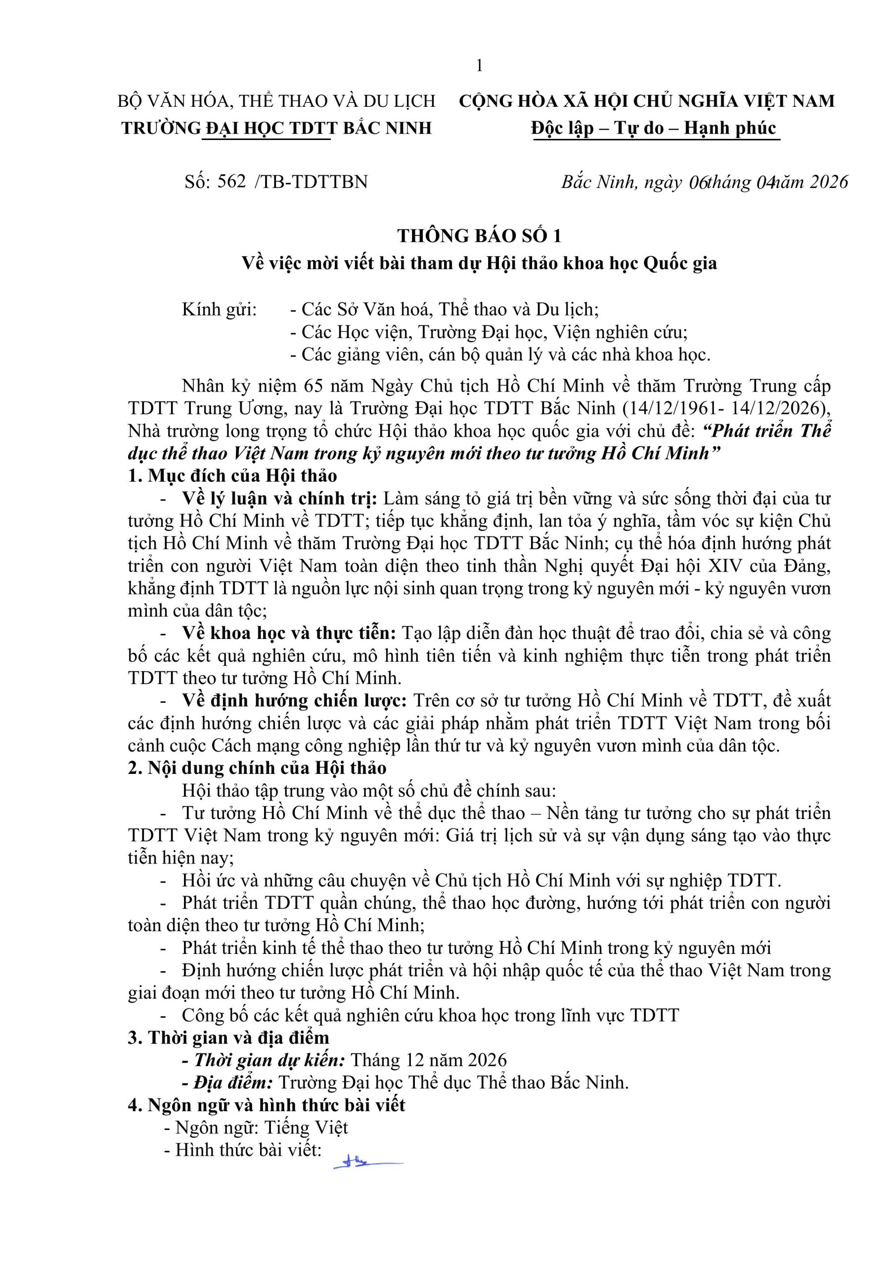 TDTT Trung Ương, nay là Trường Đại học TDTT Bắc Ninh (14/12/1961- 14/12/2026), Nhà trường long trọng tổ chức Hội thảo khoa học quốc gia với chủ đề: “Phát triển Thể dục thể thao Việt Nam trong kỷ nguyên mới theo tư tưởng Hồ Chí Minh”