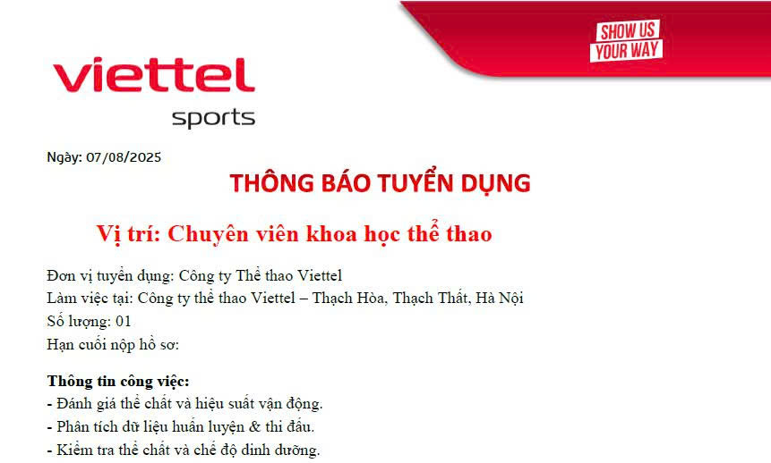 Thông báo tuyển dụng vị trí chuyên viên khoa học thể thao