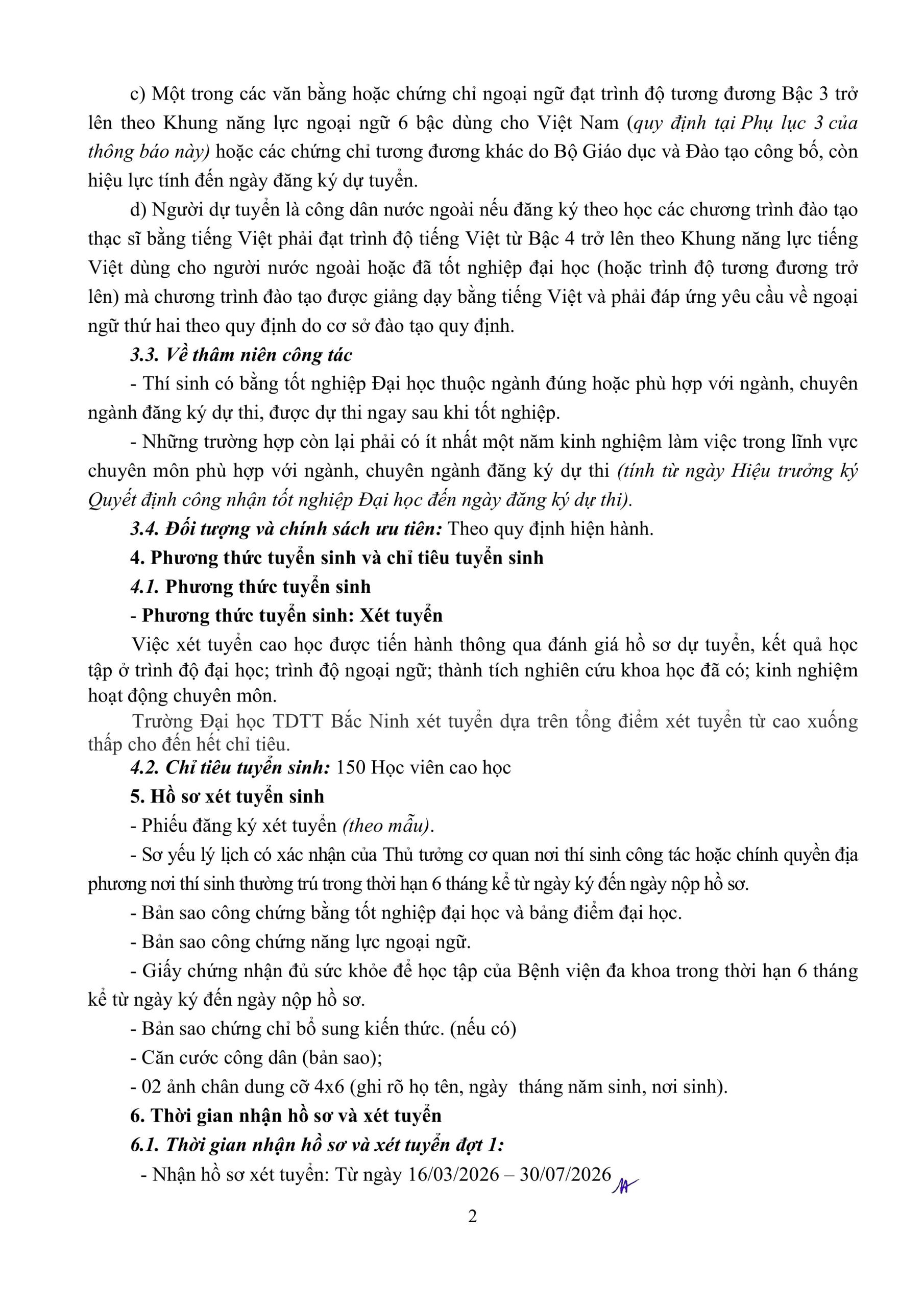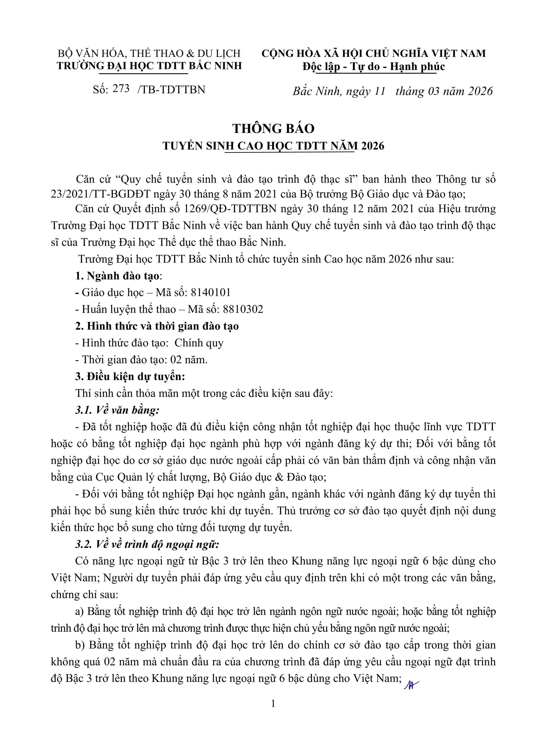Trường đại học Thể dục thể thao Bắc Ninh thông báo tuyển sinh Cao học năm 2026