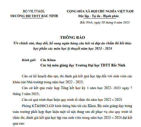 Thông báo về việc chỉnh sửa, bổ xung ngân hàng câu hỏi và đáp án chấm thi kết thúc học phần các môn học lý thuyết năm học 2023-2024