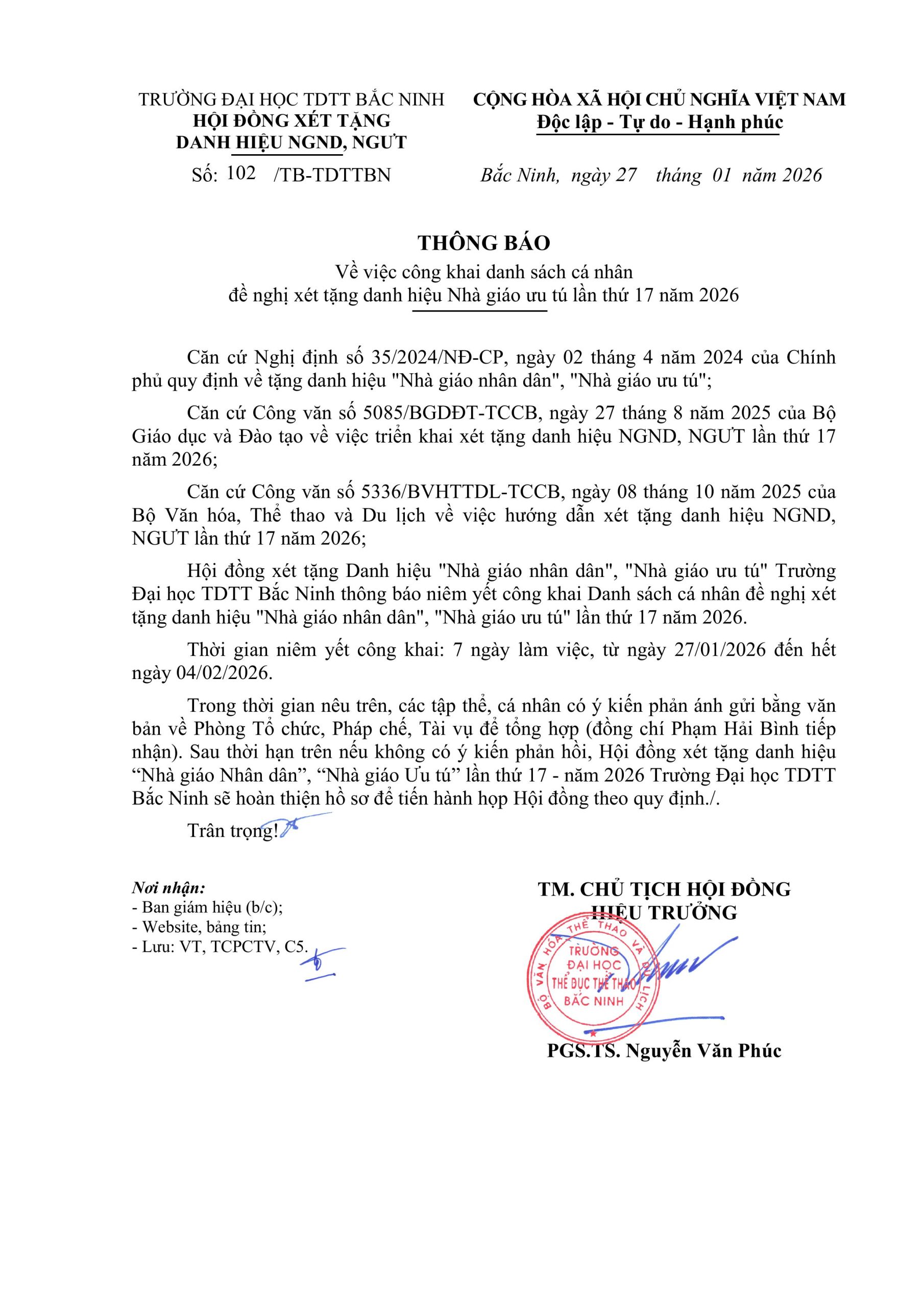 Hội đồng xét tặng Danh hiệu "Nhà giáo nhân dân", "Nhà giáo ưu tú" Trường Đại học TDTT Bắc Ninh thông báo niêm yết công khai Danh sách cá nhân đề nghị xét tặng danh hiệu "Nhà giáo nhân dân", "Nhà giáo ưu tú" lần thứ 17 năm 2026.