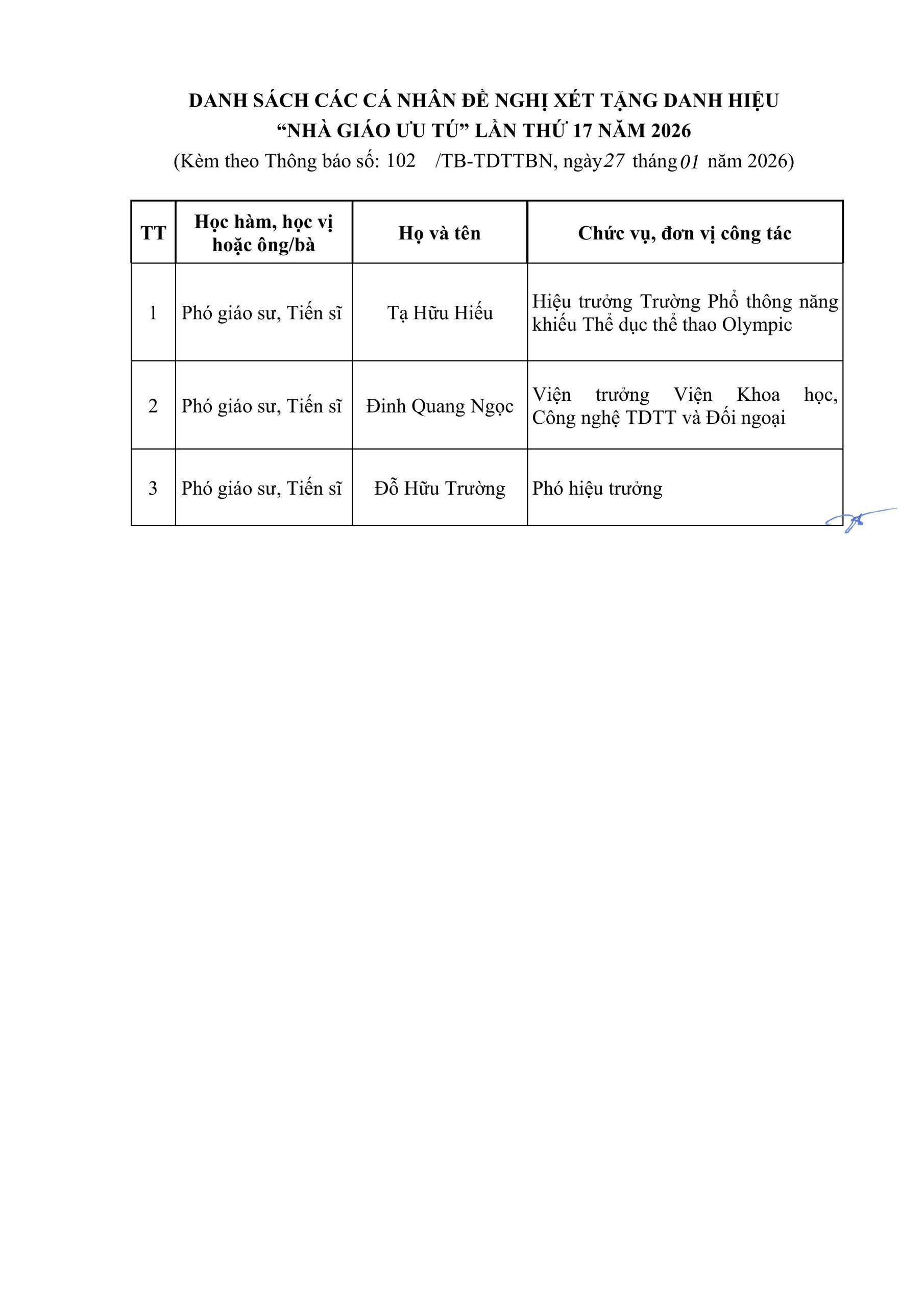 Thông báo về việc công khai danh sách cá nhân đề nghị xét tặng danh hiệu Nhà giáo ưu tú lần thứ 17 năm 2026