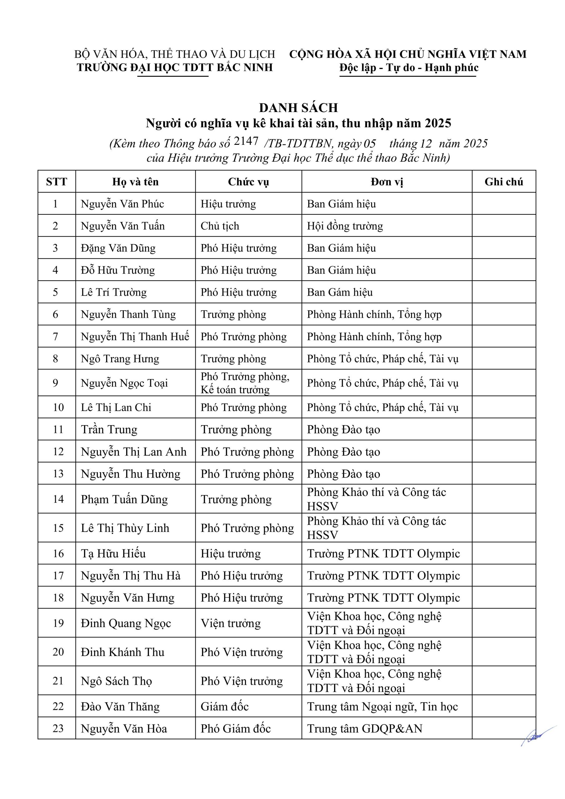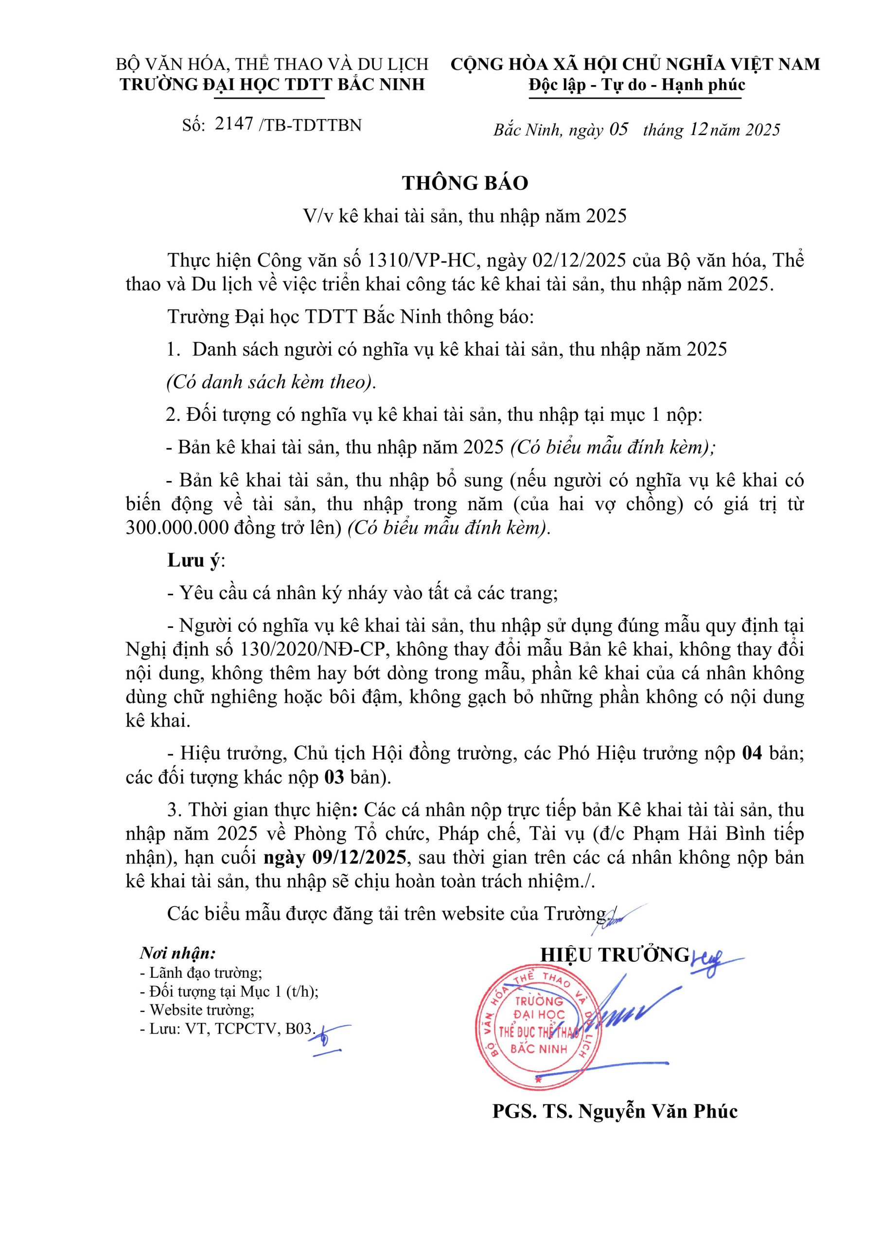 Trường Đại học Thể dục thể thao Bắc Ninh thông báo về việc kê khai tài sản, thu nhập năm 2025