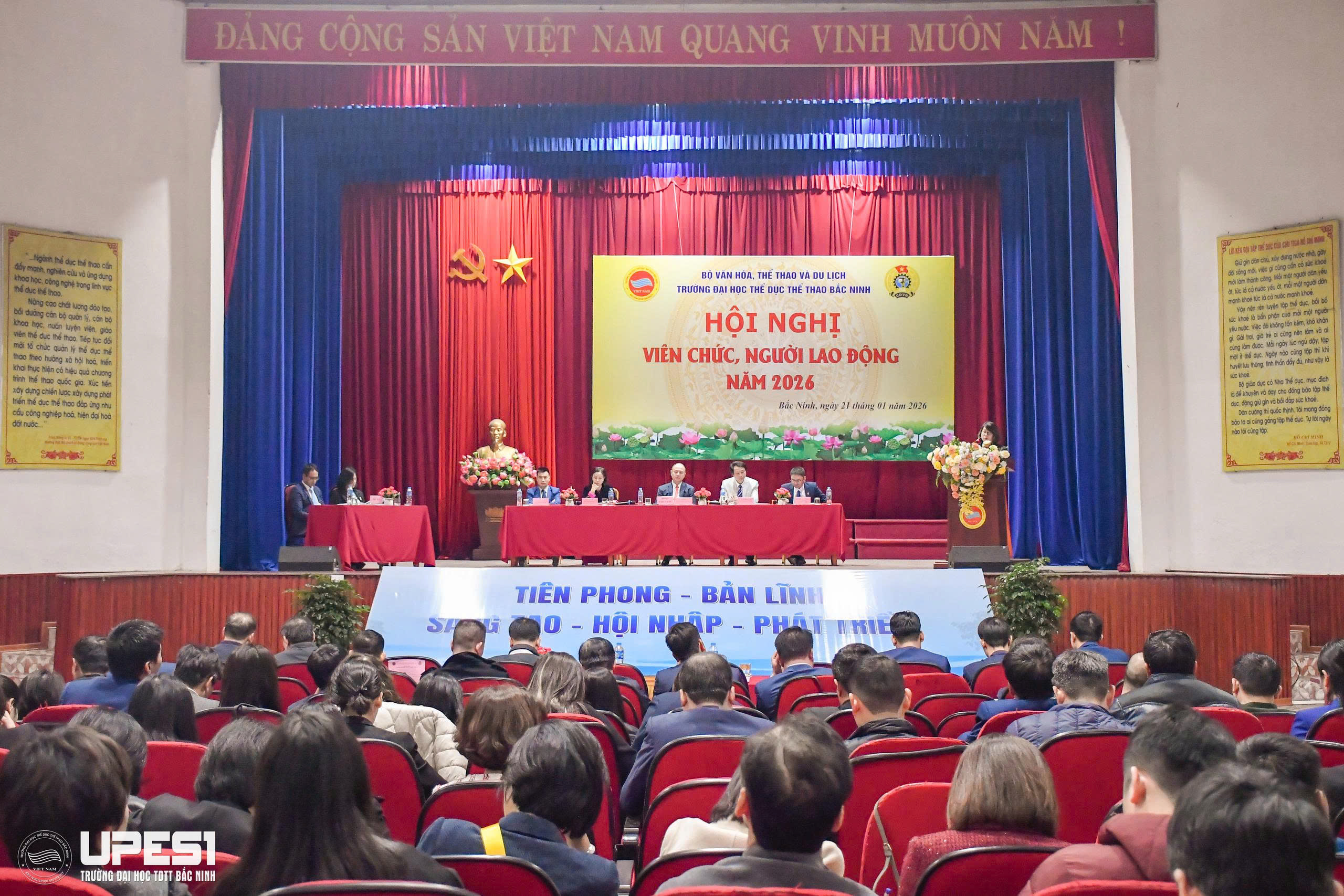 Chiều ngày 21/01/2026, Trường Đại học Thể dục Thể thao (TDTT) Bắc Ninh đã tổ chức trọng thể Hội nghị viên chức, người lao động năm 2026. Hội nghị là diễn đàn chính trị quan trọng để tập thể nhà trường đánh giá kết quả thực hiện nhiệm vụ năm 2025, đồng thời thống nhất phương hướng, nhiệm vụ và các giải pháp then chốt cho năm 2026.